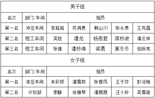 通過每次的消防演練及消防知識的培訓,不僅進一步增強了廣大員工的防范意識和自救能力,了解和掌握如何識別危險、如何采取必要的應急措施等基本操作,以便在事故中達到快速、有序、及時、有效的效果。同時為了鼓勵廣大員工能更踴躍的融入到消防演練的集體中,在此次演練評選出男子組前三名、女子組前兩名,并頒發(fā)了獎狀及獎金,以資鼓勵。獲獎名單如下: