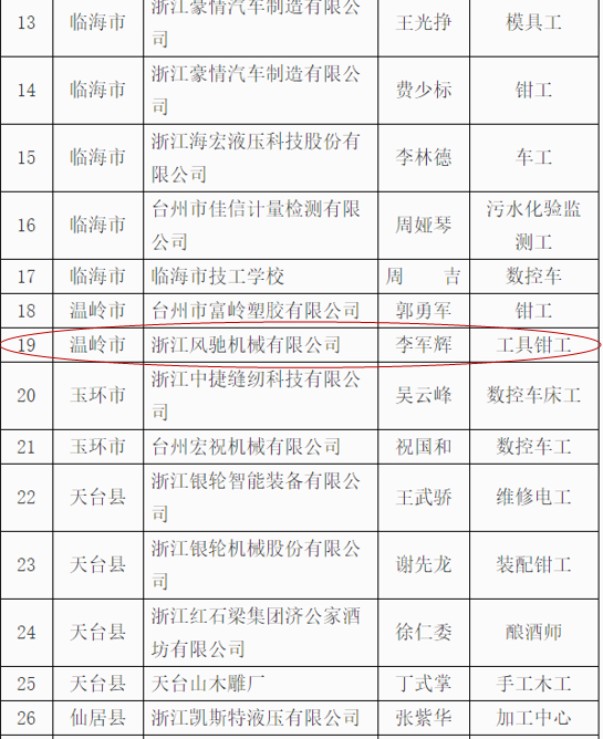 我司根據《關于實施2019年“杰出臺州工匠”、臺州市引進企業“首席技能大師”認定工作》的通知要求,通過公司推薦,資格初審,經專家組認定評審,我司研發中心工程師李軍輝成功順利入選被評選為“杰出臺州工匠”,并在網上予以公示,符合公司的價值觀“客戶為先、誠信負責、團隊合作、務實創新”精神。